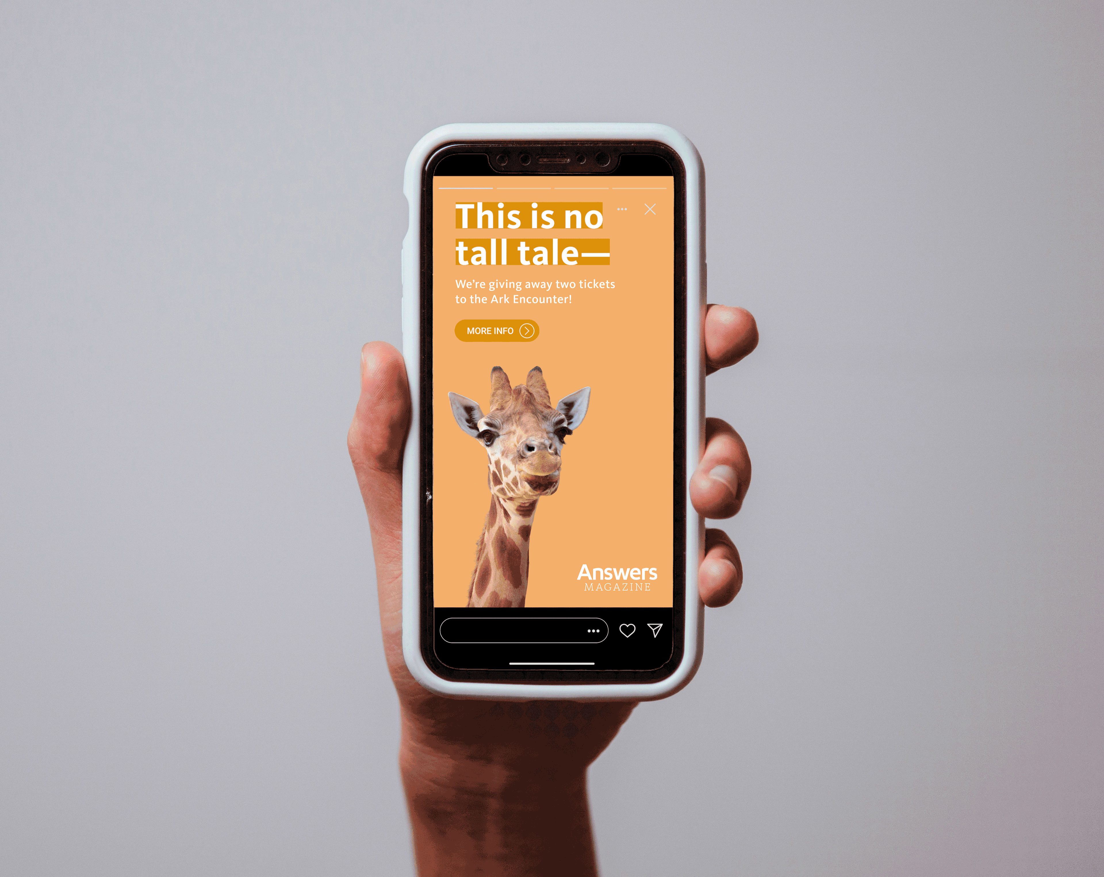 After reaching 1,000 followers on Instagram, Answers Magazine launched a giveaway for two free tickets to the Ark Encounter. To enter, participants were asked to follow Answers Magazine on Instagram and comment who they would bring to the Ark. I was responsible for designing a series of engaging Instagram story graphics to promote the giveaway and build anticipation leading up to the winner announcement. The campaign was a success, increasing our follower count by over 200 and driving strong audience engagement.